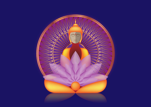 Buddha sitting in meditation over Golden Mandala, esoteric purple lotus vector illustration. Vintage sacred culture background. Indian, Buddhism, spiritual art. Gold, spirituality, Thai god, yoga